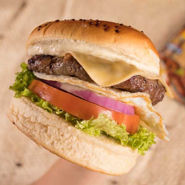 180gr de carne, tocineta, huevo frito, queso fundido, cebolla grille, tomate milano lechuga crespa