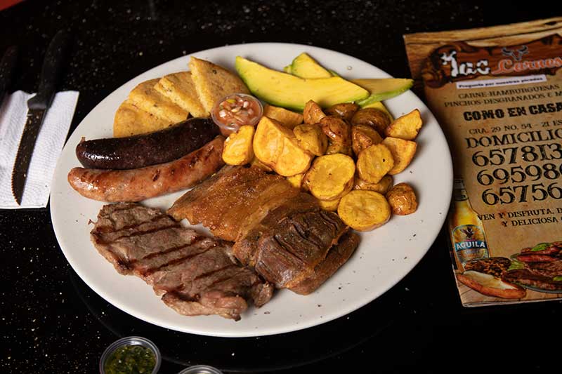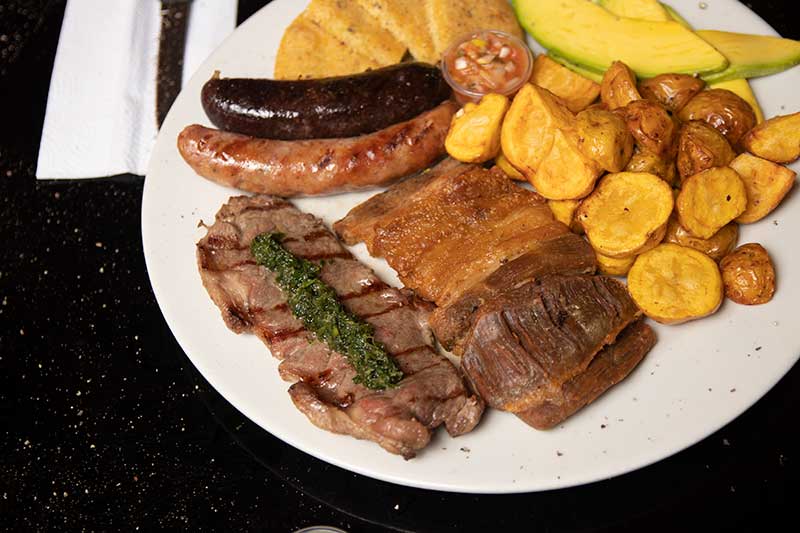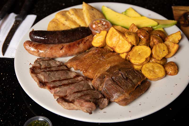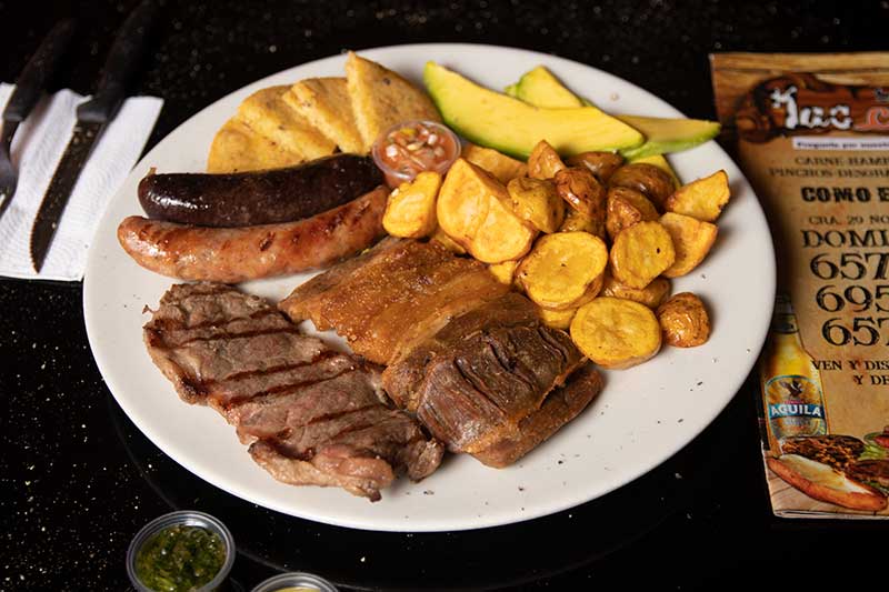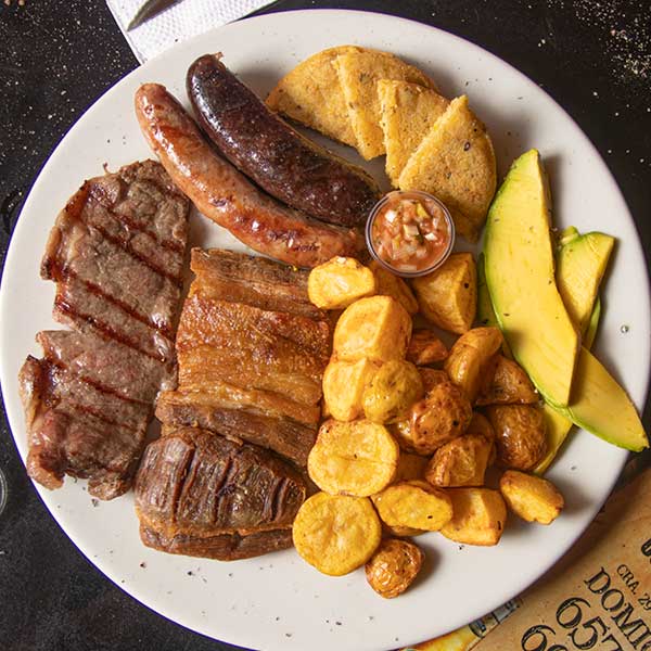 Exquisita porción de chorizo, rellena, chicharrón, chata. Acompañado de arepa papa criolla