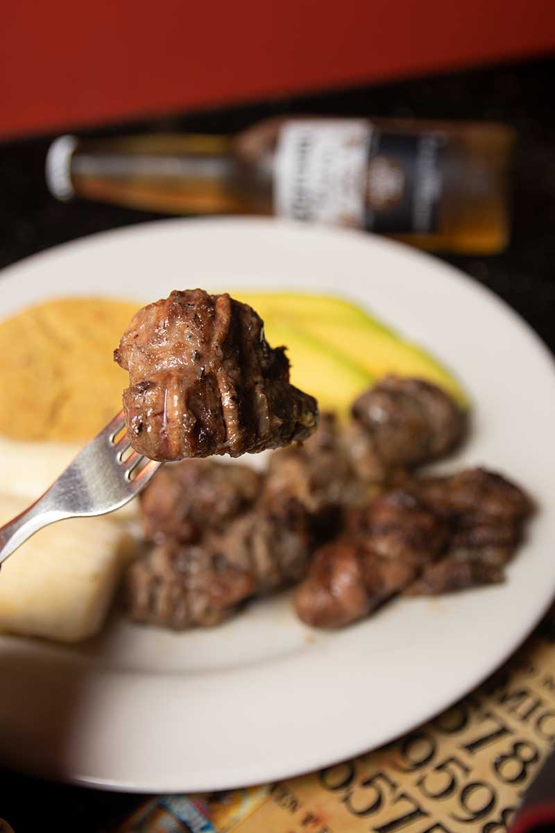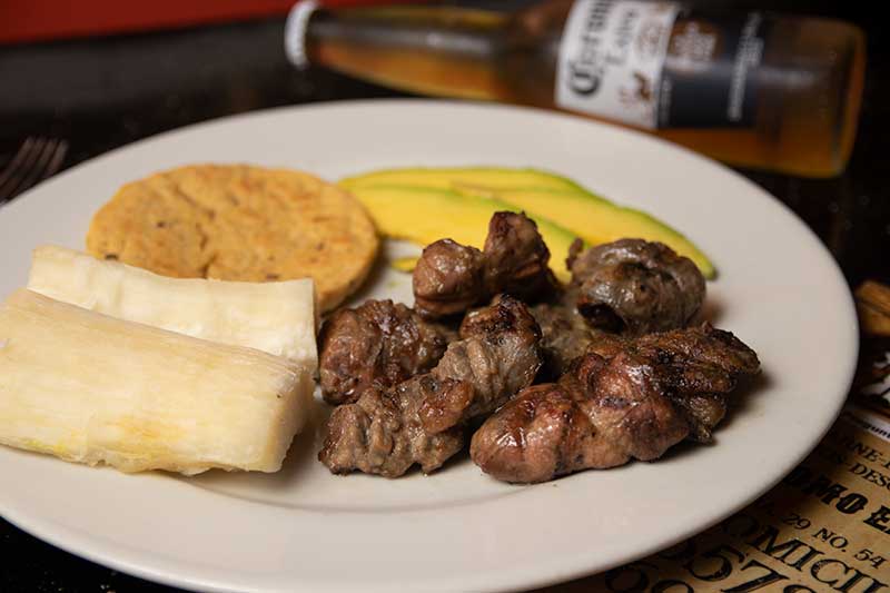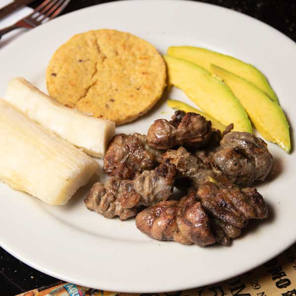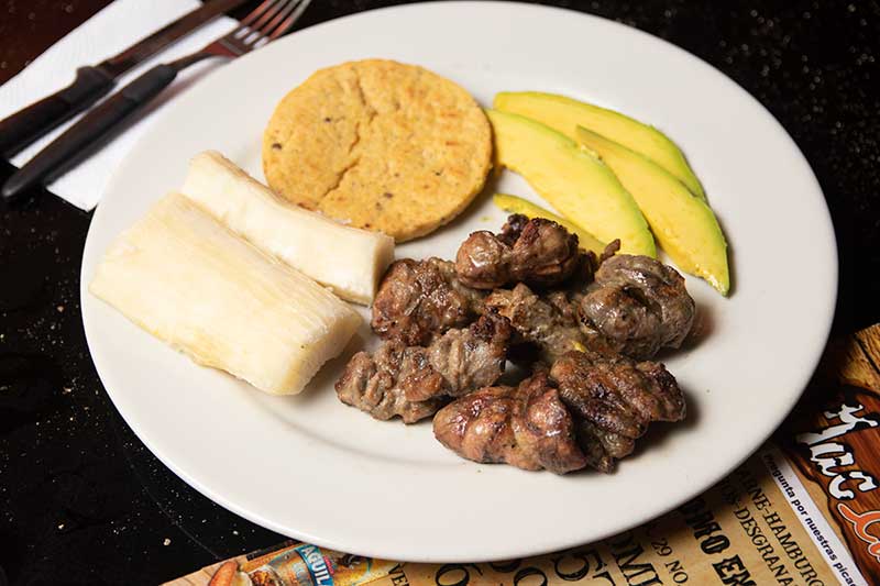 Deliciosa porción de chunchulla frita o asada al carbón, acompañada de yuca, arepa
