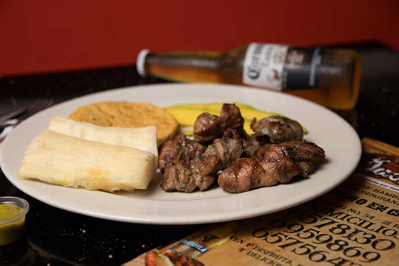 Exquisita porción de ubre asada, acompañada de yuca arepa