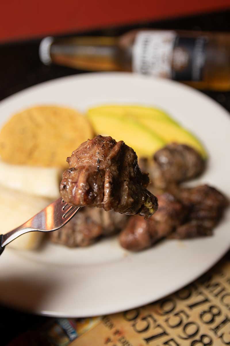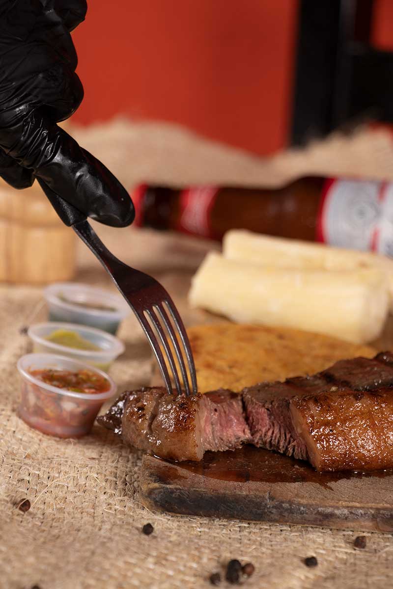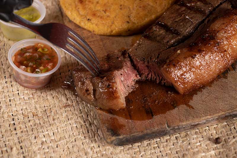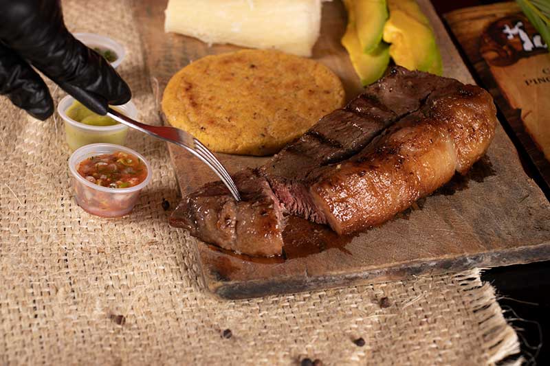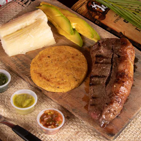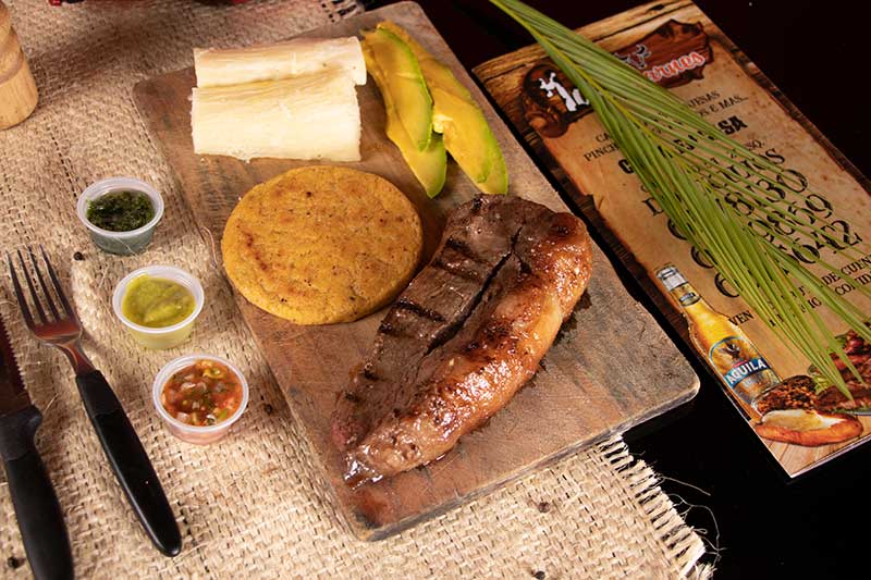 Jugoso lomito Fino asado acompañado de yuca, arepa.
