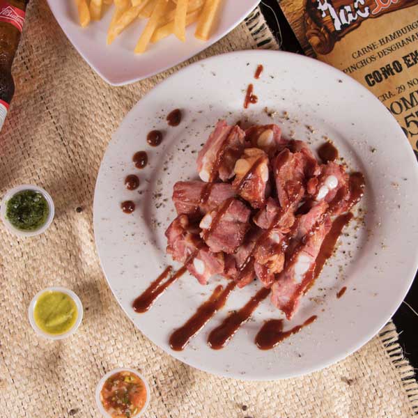 Delicioso lomo de cerdo en salsa BBQ ó salsa de piña acompañado de yuca, arepas.