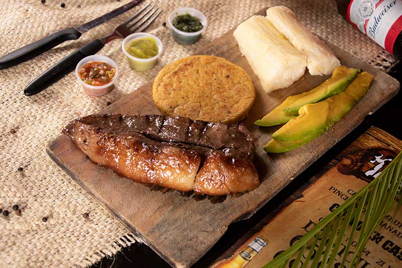 Delicioso lomito fino oreado acompañado de yuca, arepa.